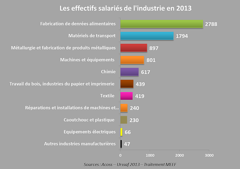 Avec 2788 salariés en 2013, l’industrie agroalimentaire est le 1er secteur industriel employeur devant les secteurs de l’aéronautique, la métallurgie, fabrication de machines et équipements.